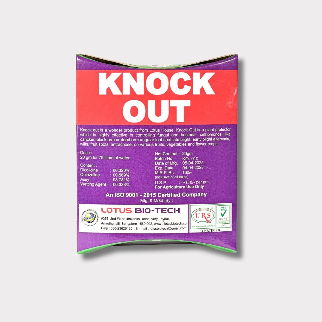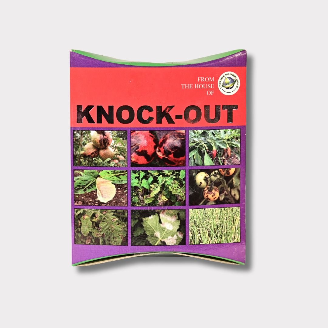 KNOCK-OUT is a highly effective plant protector designed to control a wide range of plant diseases including Xanthamonus, canker, black arm, angular leaf spot, blight, and anthracnose. Suitable for fruits, vegetables, and flowers, it ensures healthy crops and better yield.