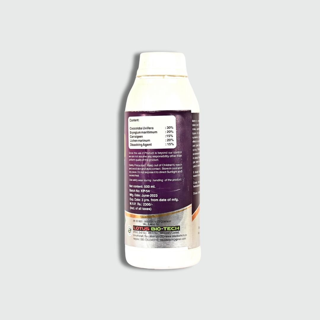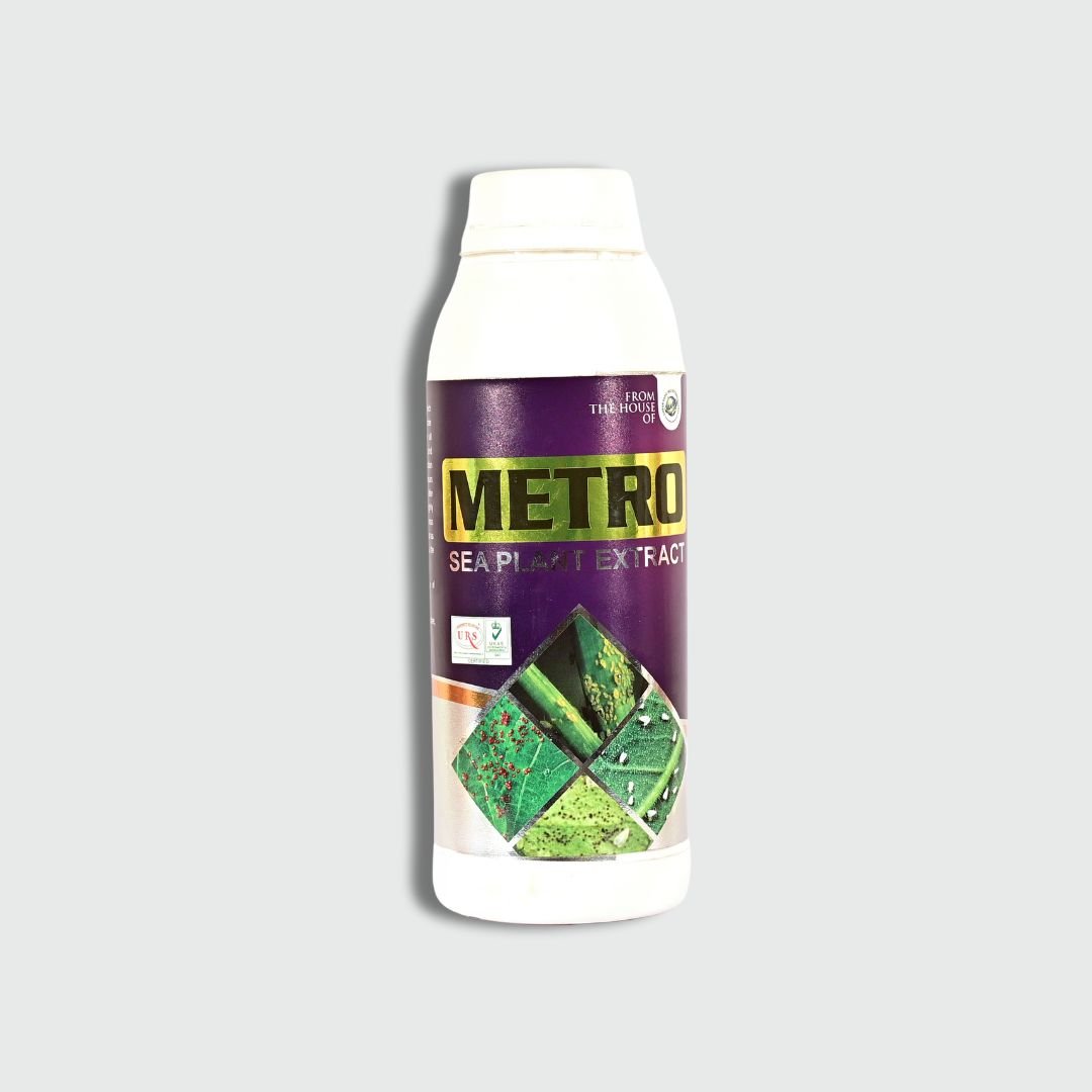 METRO is an organic plant protector formulated with natural sea plant extracts. It effectively controls a wide range of sucking pests like red mites, yellow mites, spider mites, aphids, thrips, and jassids. Additionally, it accelerates the photosynthesis process, promoting healthy greenery in crops.